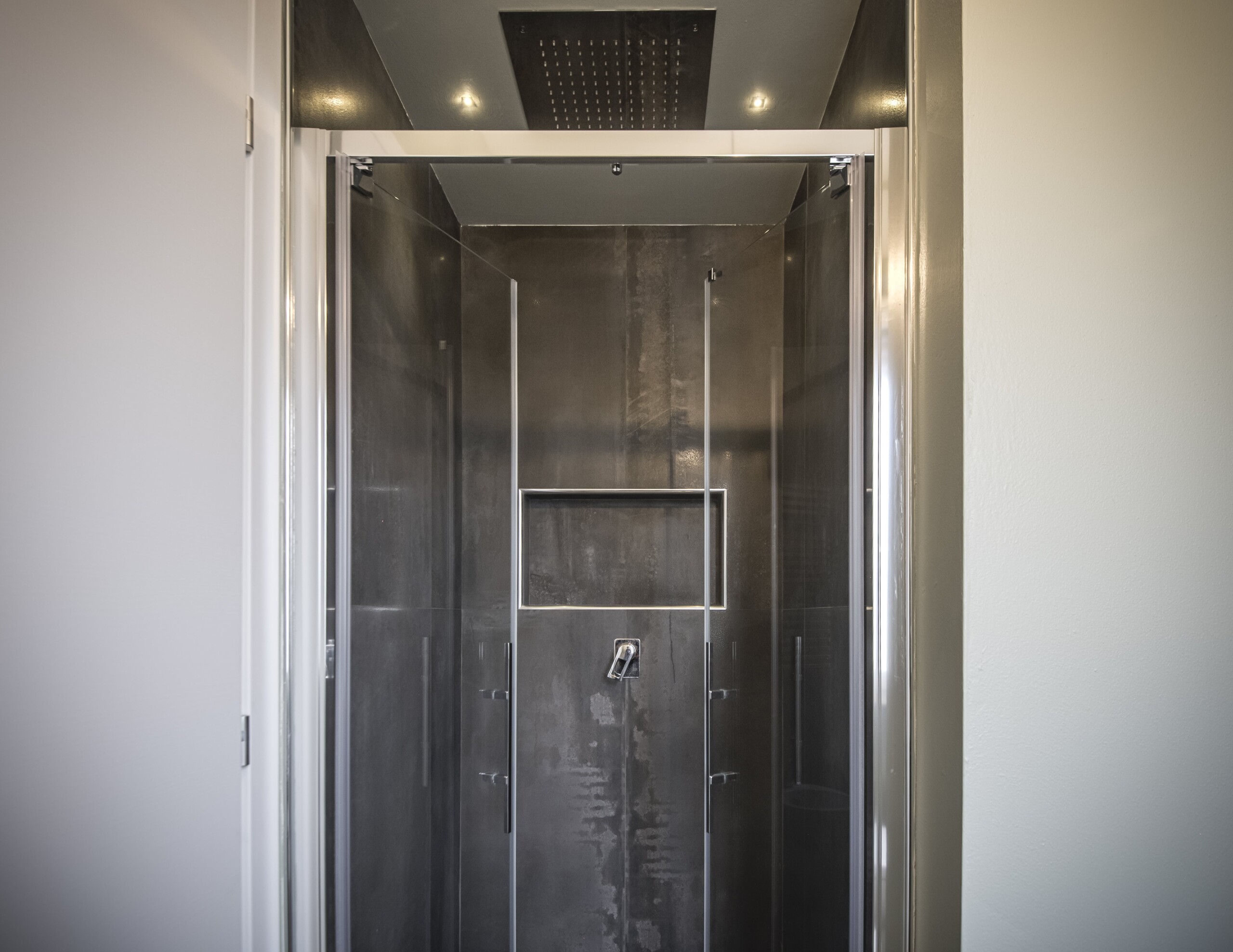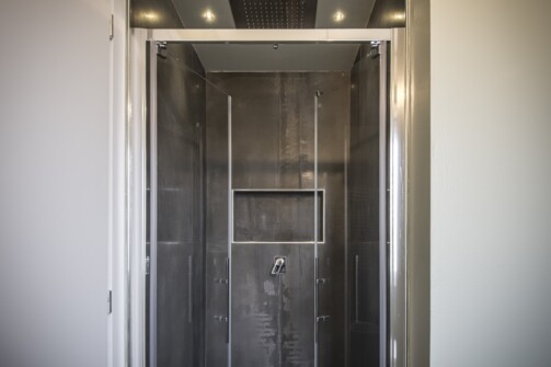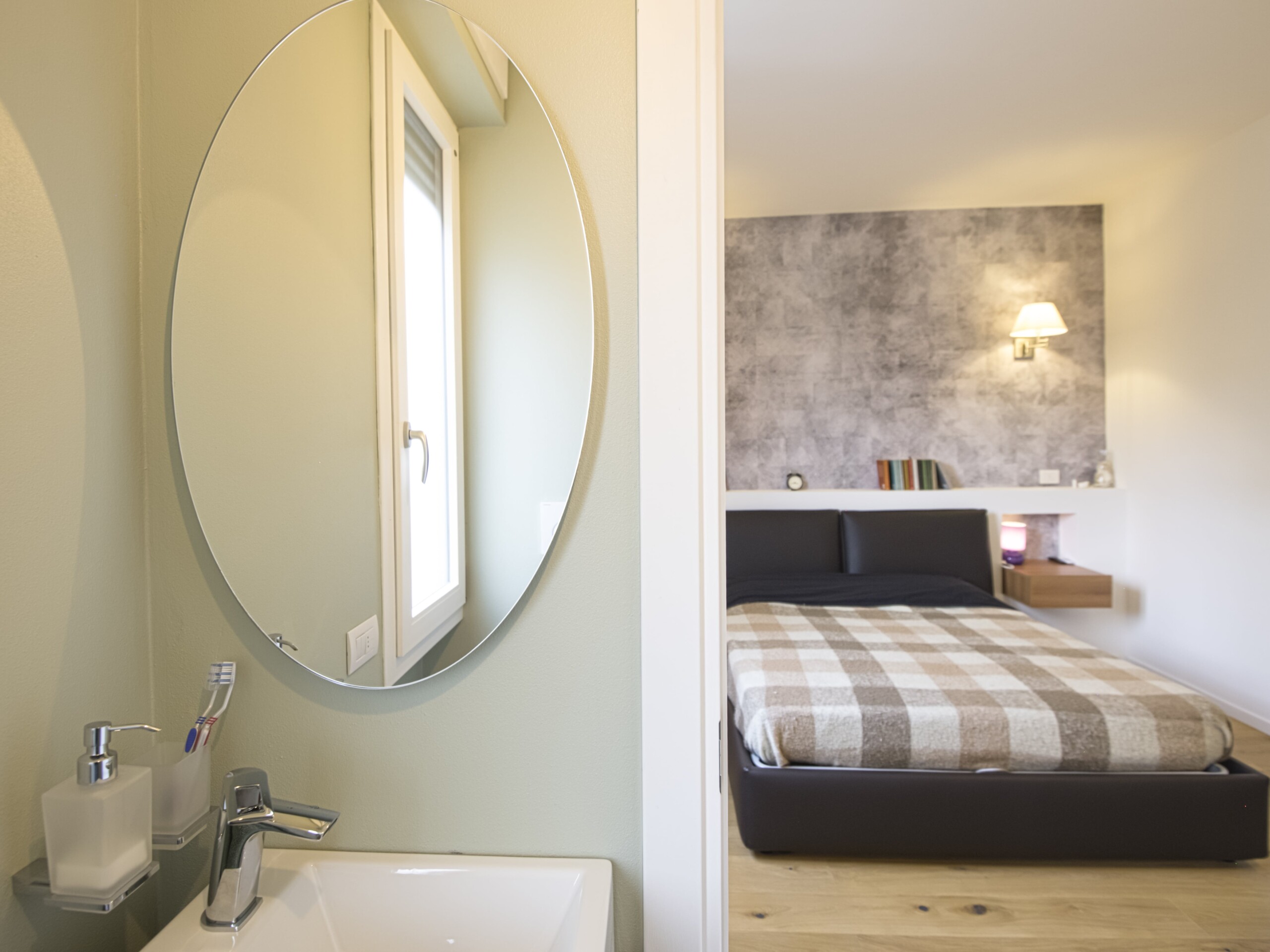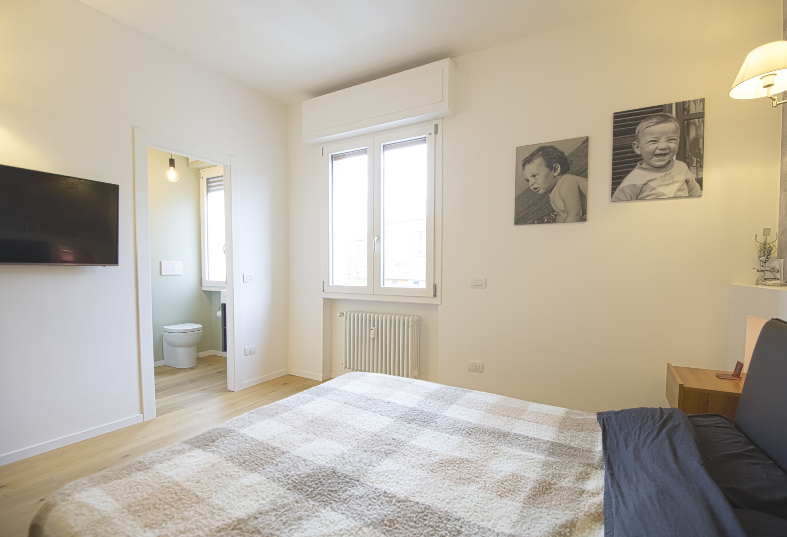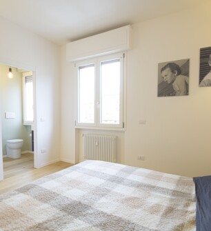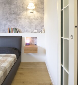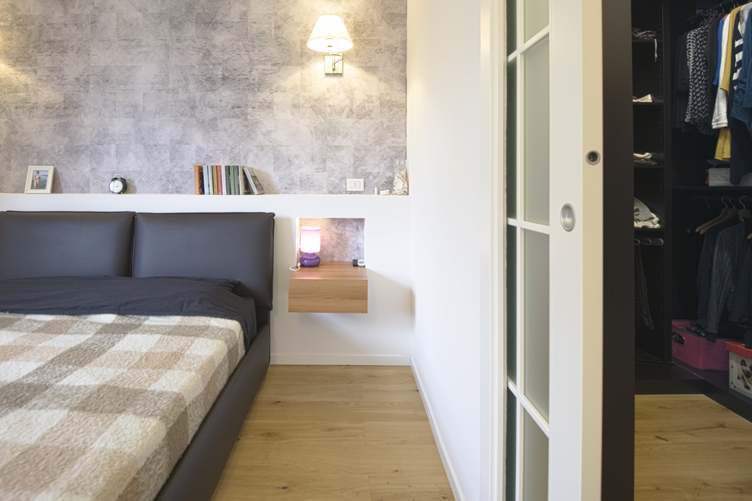 La camera matrimoniale diventa una mini-suite, corredata di un delizioso bagno privato e una cabina armadio. Il tutto studiato nel dettaglio per i nostri clienti. La testata del letto, realizzata in cartongesso, funge da piano d’appoggio e sostiene i due comodini incassati, ed è impreziosita da una carta da parati con una texture accattivante.