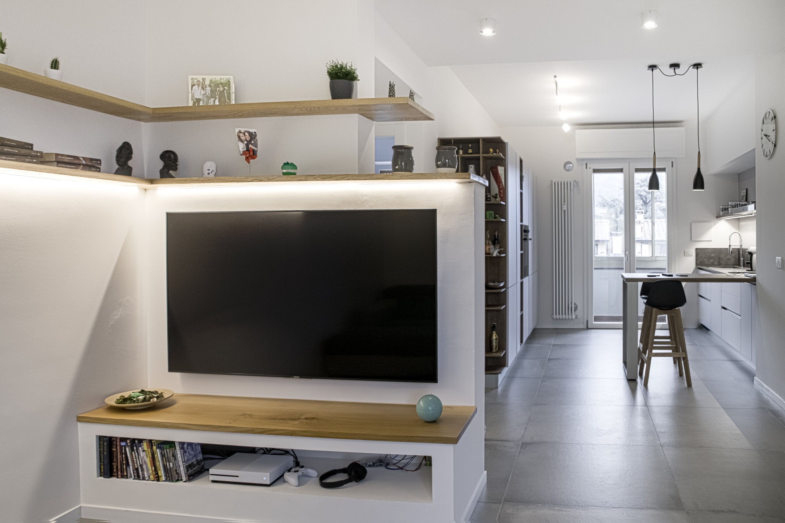 La zona giorno viene completamente aperta, creando un ambiente unico, luminoso e versatile.